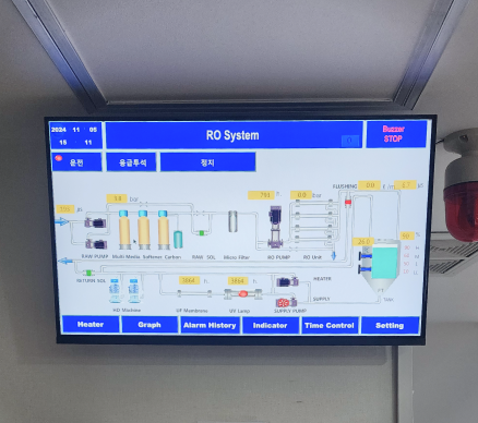 외부 모니터RO 장비 상태를 한눈에 확인하는 실시간 모니터링 시스템RO 장비의 운전 상황과 알람 상태를 외부에서 실시간으로 확인할 수 있으며,